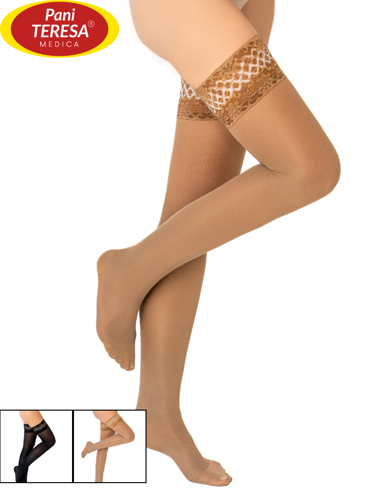 Szeroki mankiet podkolanówek, silikonowy koronkowy mankiet pończoch oraz stabilna część majtkowa zapobiegają zsuwaniu się wyrobu.